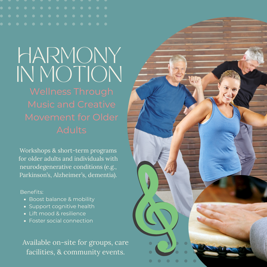 While not offered as a regular ongoing class, Harmony in Motion can be booked as an on-site workshop or short-term program for community groups, care facilities, or special events.